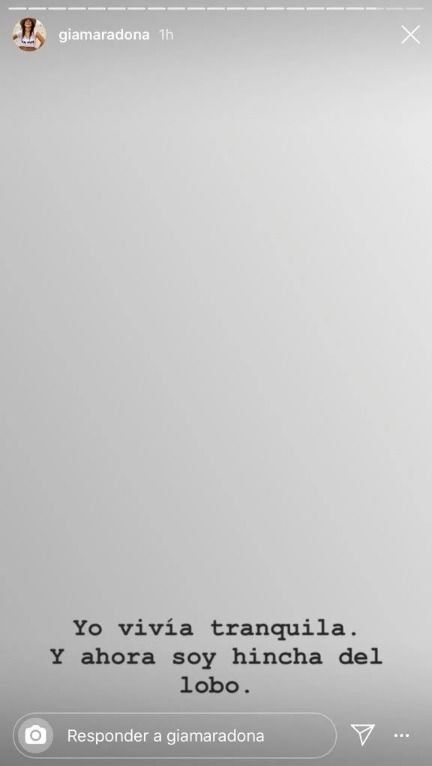 Yo vivía tranquila. Y ahora soy hincha del Lobo”, escribió Gianinna Maradona en sus historias de Instagram. El mensaje de aliento para el Diez llegó luego de la derrota por 2 a 1 ante Racing, en su debut como entrenador de Gimnasia. La situación del flamante equipo de su padre no es la ideal ya que está sumergido en el fondo de la tabla de posiciones y su permanencia en la Primera División del fútbol argentino pende de un hilo.