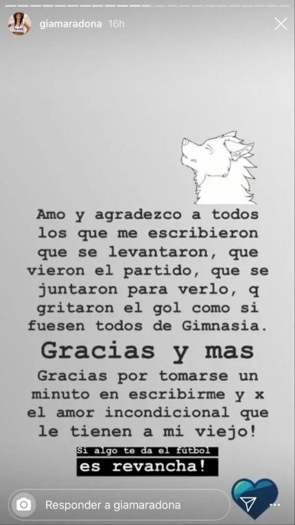 En este marco, la hija del futbolista publicó otro mensaje más extenso y sentido, en el cual agradeció a todos aquellos que alentaron por el club mens sana. “Amo y agradezco a todos los que me escribieron, que se levantaron, que vieron el partido, que se juntaron para verlo, que gritaron el gol como si fuesen todos de Gimnasia. Gracias y más gracias por tomarse un minuto en escribirme y por el amor incondicional que le tienen a mi viejo. ¡Si algo te da el fútbol es revancha!".