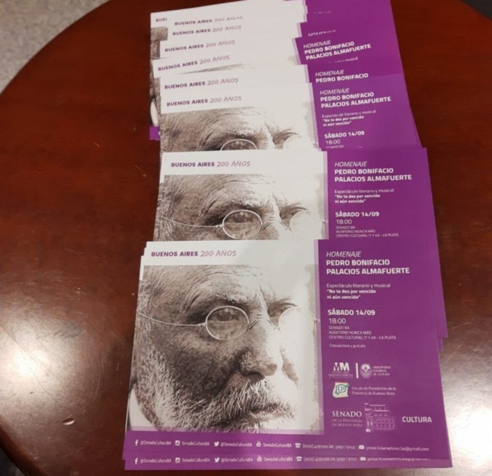 El Centro Cultural “Nunca Más” del Senado provincial, en 7 y 49, abrió sus puertas el pasado sábado para realizar un homenaje literario y musical a la figura de Pedro Bonifacio Palacios, Almafuerte. El evento estuvo organizado por Guillermo Cavia y Felix Lugones, miembros del Círculo de Periodistas de la Provincia de Buenos Aires.