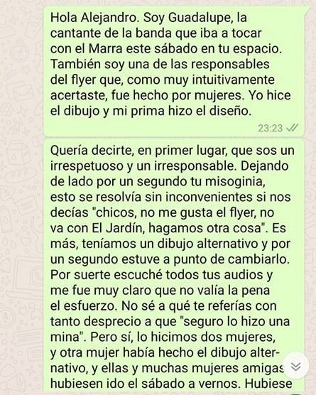 Al hombre no le gustó el diseño de la publicidad gráfica y explotó con dichos que fueron repudiados por la artista y compartidos en Instagram. "Ni loco voy a usar ese flyer. La juventud está del orto", dijo el hombre en uno de los audios que publicó Guadalupe para visibilizar la situación y mostrar "los códigos" del dueño del local. "¿Quién lo hizo? ¿Quién hizo esa porquería? Decile que se vaya al carajo", lanzó en otro de sus repudiados mensajes y además lanzó: "Quiero creer que es una mina la que lo hizo".