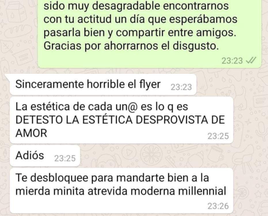 Al principio, el intercambio fue con su amigo Marra, a quien el dueño del restaurante cuestionó la "estética" del diseño. Una mujer con pelo rosa y excremento en la cabeza –similar al emoji de caca– fue lo que lo sacó de las casillas. Al escucharlo, la joven decidió comunicarse directamente con él, pero la respuesta que recibió solo empeoró la situación. "Sinceramente horrible el flyer. La estética de cada un@ es lo que es. Detesto la estética desprovista de amor. Adiós. Te desbloqueé para mandarte bien a la mierda, minita atrevida moderna millennial", le contestó por privado.