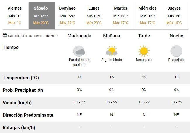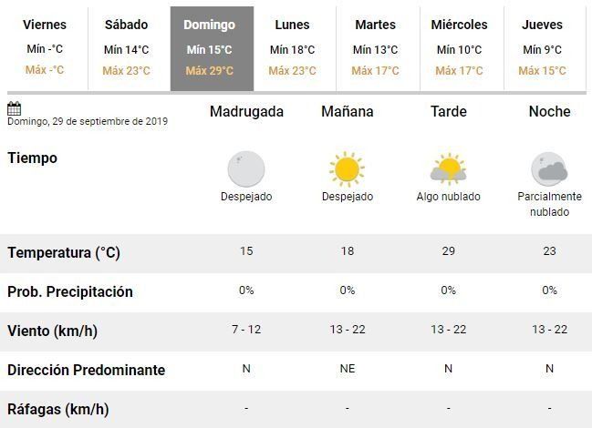 La jornada transcurrirá con un excelente clima, sol y vientos soplando desde norte y noreste con algunas ráfagas leves de entre 13 y 22 km/h.