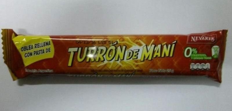 Oblea rellena con crema de maní cubierta con baño de repostería, RNPA: 02-593292, Lote: L1 10 41, marca: Nevares, fecha de vencimiento: 31/12/2019, RNE: 02-030718.