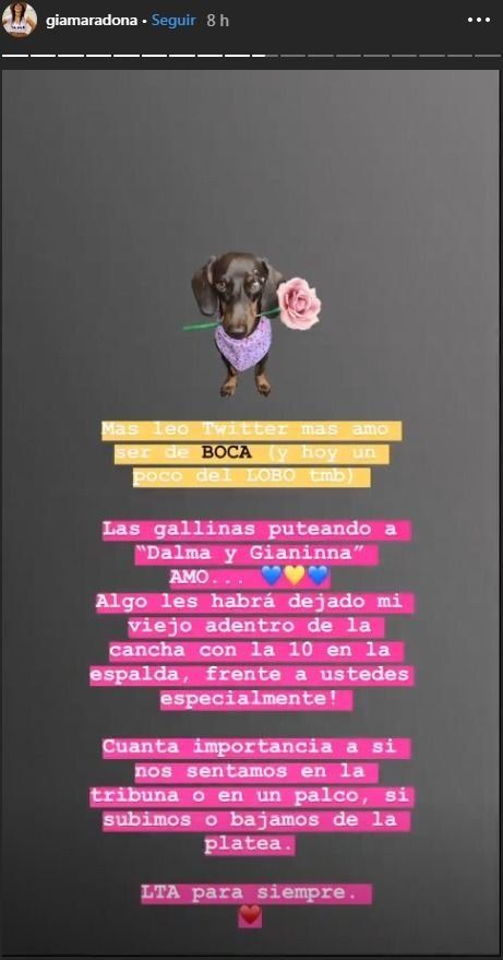 Gianinna Maradona, tras el partido aprovechó para apuntar contra los hinchas de River. “Más leo Twitter y más amo ser de Boca (y hoy un poco del LOBO también)...”, es la frase con la que comienza la publicación, de la hija menor del Diez. “Las gallinas puteando a ‘Dalma y Gianinna’...”, continuó en su posteo.