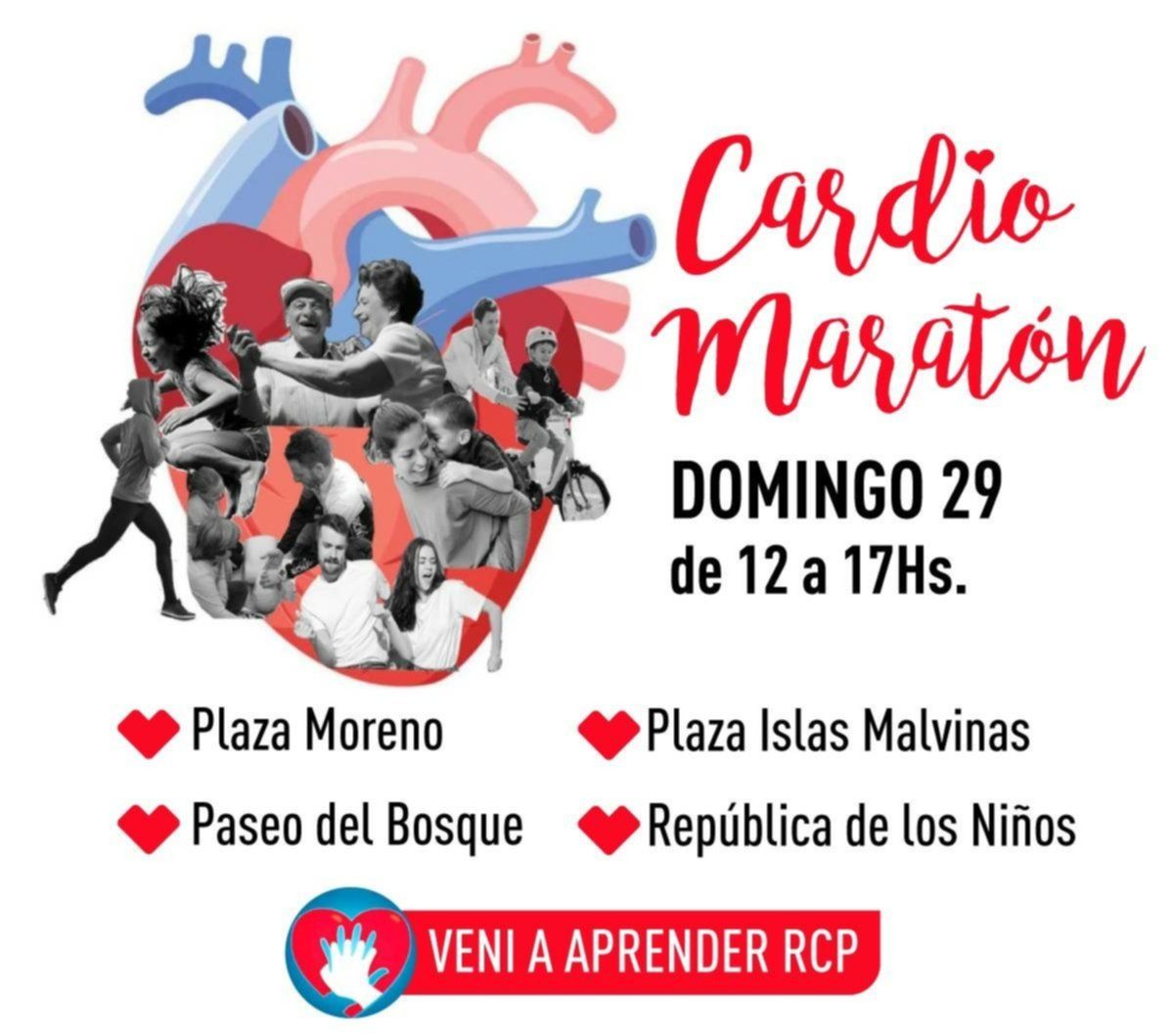 En el marco del Día Mundial del Corazón, que se celebra cada 29 de septiembre, la Municipalidad de La Plata participará de una jornada de entrenamiento en Reanimación Cardio Pulmonar (RCP) que tendrá lugar este domingo, de 12 a 17 horas, en Plaza Moreno, Plaza Islas Malvinas, el Paseo del Bosque y la República de los Niños, en forma simultánea.