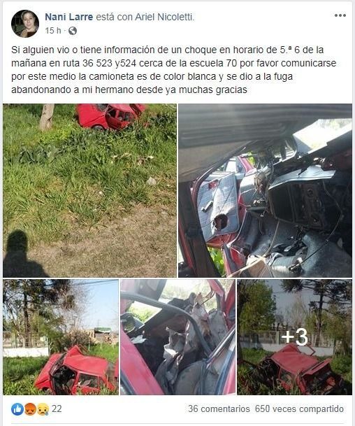 El siniestro ocurrió en la madrugada del sábado pasado, entre las 5 y las 6 de la mañana en esa vía, entre 523 y 524. La única información que tienen confirmada hasta el momento es que el Duna rojo fue colisionado por un vehículo de color blanco, que escapó tras el impacto y dejó abandonado al lesionado.