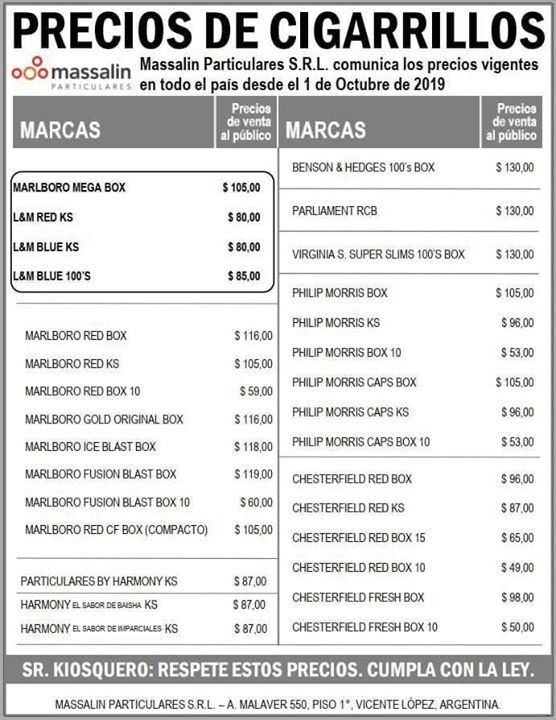 La suba es la sexta en lo que va del año, por lo que un Marlboro Box de 20, por ejemplo, comenzó el 2019 en $81 y ahora quedará en $116. Por su parte, atados de las marcas marcas como Marlboro Mega Box, Philip Morris Box y Philip Morris Caps costarán $105, Chesterfield valdrá $96 en su versión Box y $87 en versión KS; y L&M costará $80 en sus versiones Red KS y Blue KS.
