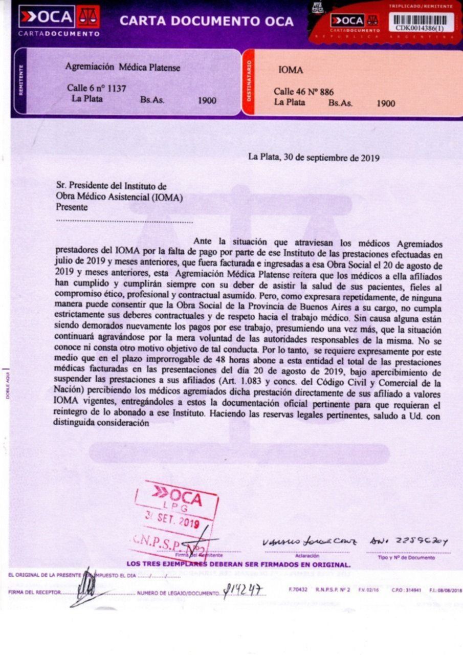 Los médicos también difundieron la carta documento que les fue enviada a las autoridades del organismo bonaerense, en la que dejan en claro que "se requiere que en el plazo improrrogable de 48 horas abone a (la AMP) el total de las prestaciones médicas facturadas, bajo apercibimiento de suspender las prestaciones de sus afiliados".