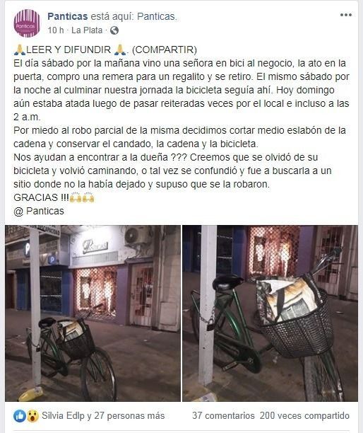 “El día sábado por la mañana vino una señora en bici al negocio, la ató en la puerta, compró una remera para un regalito y se retiró”, empieza la publicación que se hizo en el Facebook del local de ropa femenina ubicado en 137 entre 64 y 65. Y seguía: “El mismo sábado por la noche al culminar nuestra jornada la bicicleta seguía ahí. Hoy domingo aún estaba atada luego de pasar reiteradas veces por el local e incluso a las 2 a.m.”.