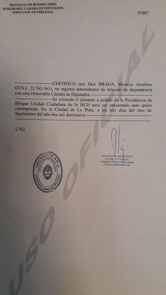En las últimas horas se conoció un documento oficial emitido por la Cámara de Diputados en el que se deja constancia que el exmiembro de la banda Los Horneros nunca trabajó en la institución. Saintout, en tanto, rechazó siquiera "conocer a Braga" y dijo que se trata de una "operación de prensa".