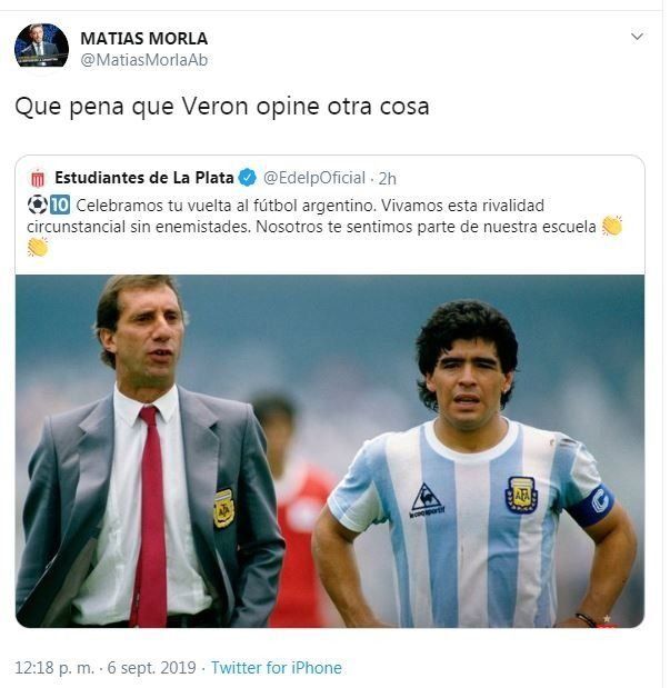 "Qué pena que Verón opine otra cosa", escribió en su propia cuenta de Twitter el abogado Matías Morla contestando al posteo que hizo Estudiantes este viernes celebrando el regreso de Diego Maradona al fútbol argentino. Mientras que el Pincha intentó poner paños fríos sobre la tensa relación entre el Diez y el presidente albirrojo Juan Sebastián Verón tras los dichos del propio astro argentino, el letrado publicó un polémico mensaje que no hace más que avivar las diferencias en lo que ya es un violento fútbol nacional.