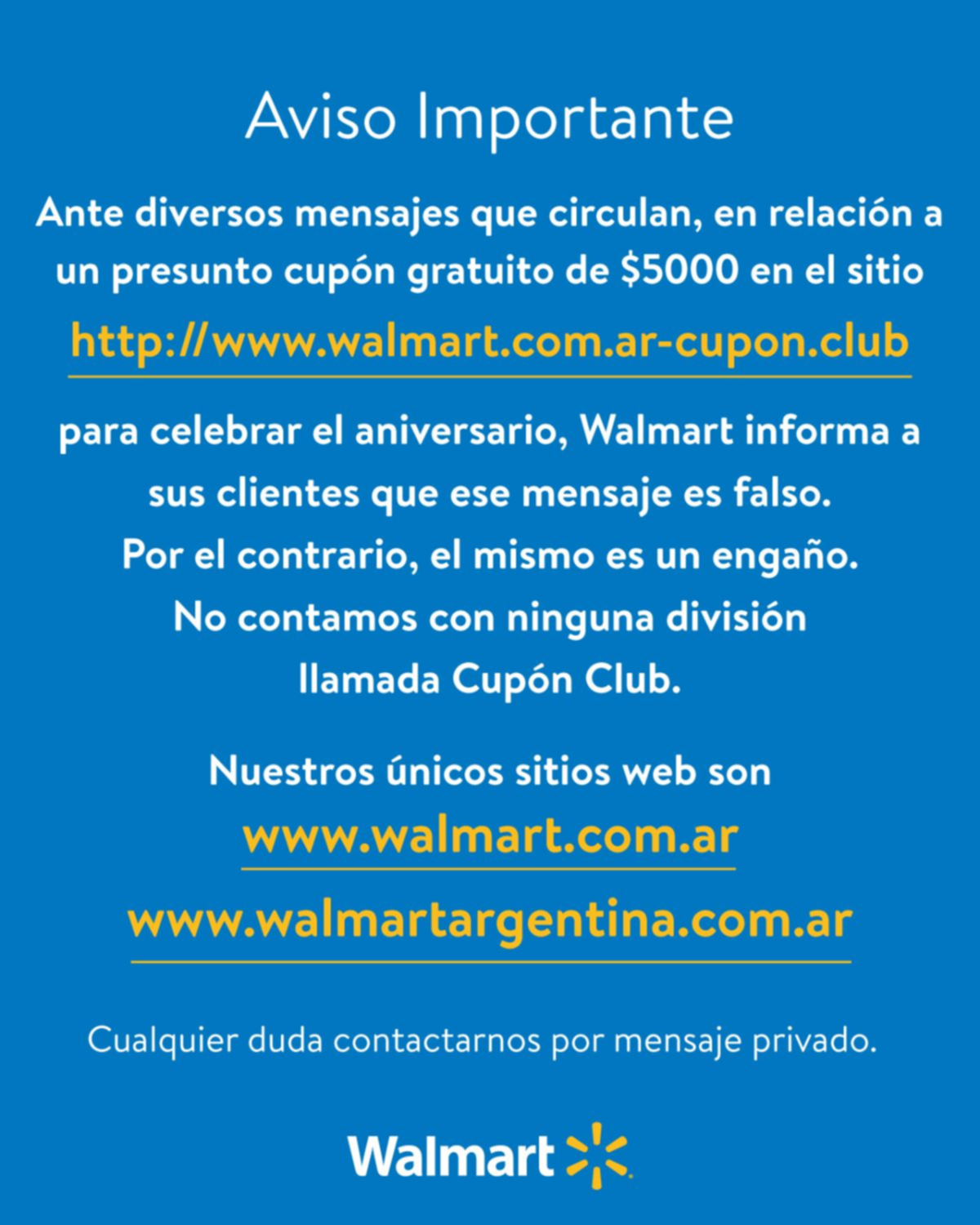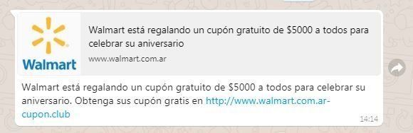"Walmart está regalando un cupón gratuito de $5.000 a todos para celebrar su aniversario", se lee en el escueto mensaje que además invita a obtenerlo haciendo click en un enlace. En medio de la crisis económica que atraviesa el país, miles de usuarios se ilusionaron con la posibilidad de contar con ese beneficio, pero todo terminó siendo una cruel mentira.