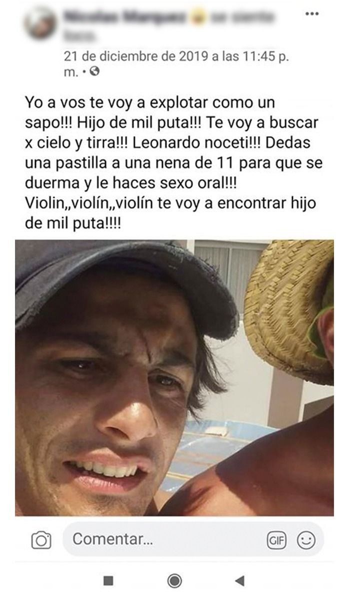 En medio de la conmoción por el descubrimiento de los restos, se dio a conocer una publicación de Facebook -de cuando Nocetti aún permanecía desaparecido- en la que se lo acusa de abusar de una criatura. "Le das una pastilla a una nena de 11 años para que se duerma y le hacés sexo oral, violín. Te voy a encontrar", publicó un familiar de la presunta víctima.