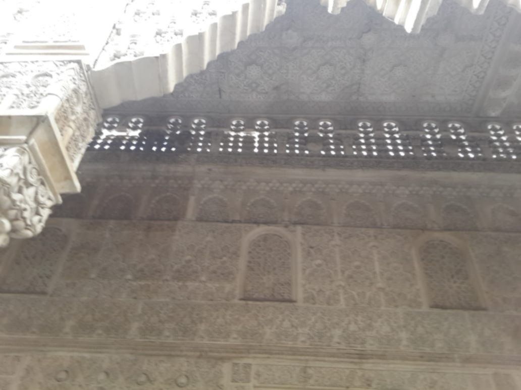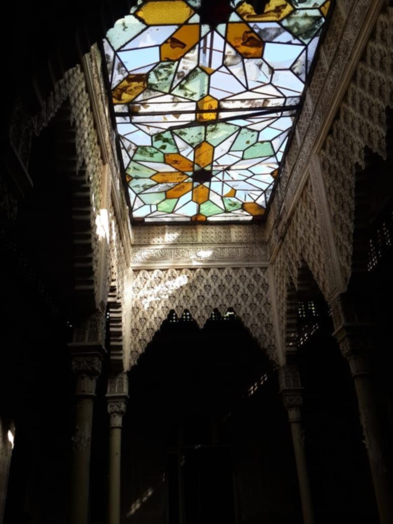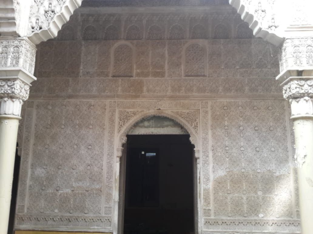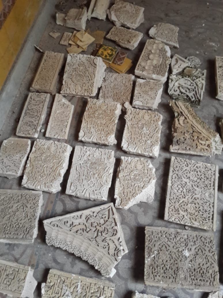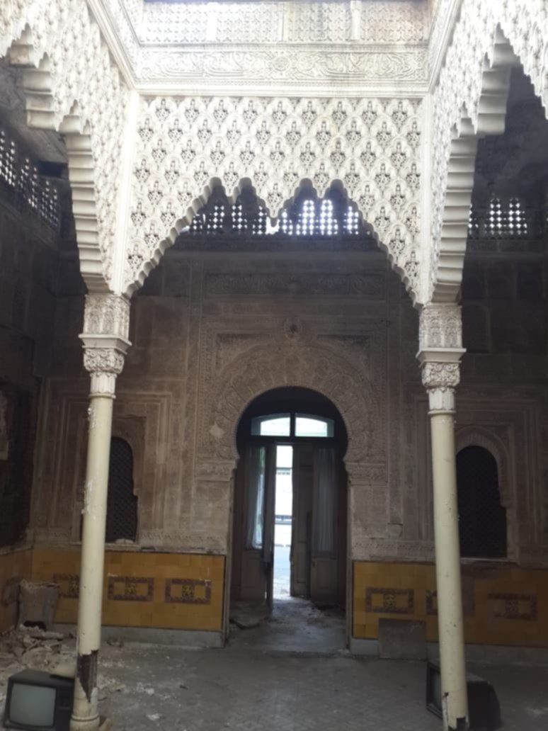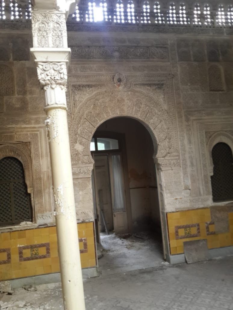 En las imágenes se puede ver el estado de abandono en el que se encuentra la obra ejecutada por el artista español Ángel Pérez Muñoz en 1889. Lo más llamativo de esta pieza, es que se integró a la casa original, es decir, a la construcción existente. Sin embargo, el descuido y el paso del tiempo están haciendo estragos en cada una de los muros y columnas que conforman el Patio Nazarí.