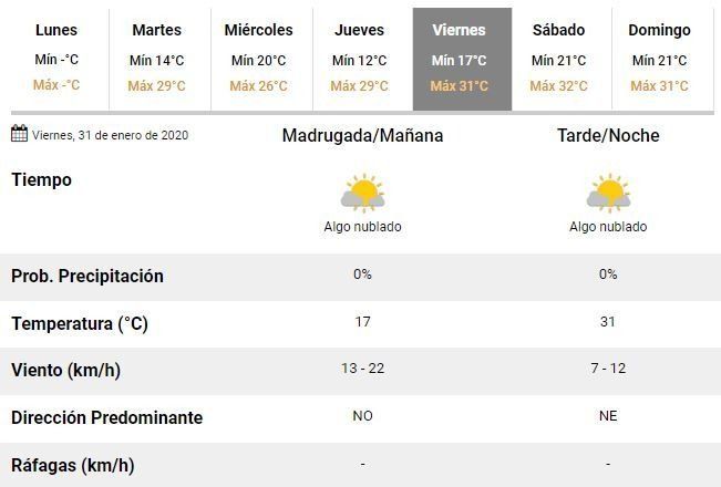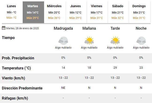 Los especialistas del Servicio Meteorológico Nacional (SMN) adelantaron que el martes transcurrirá con buen tiempo en la ciudad y temperaturas de entre 14 y 29°C. Se espera una jornada algo nublada, pero sin precipitaciones.