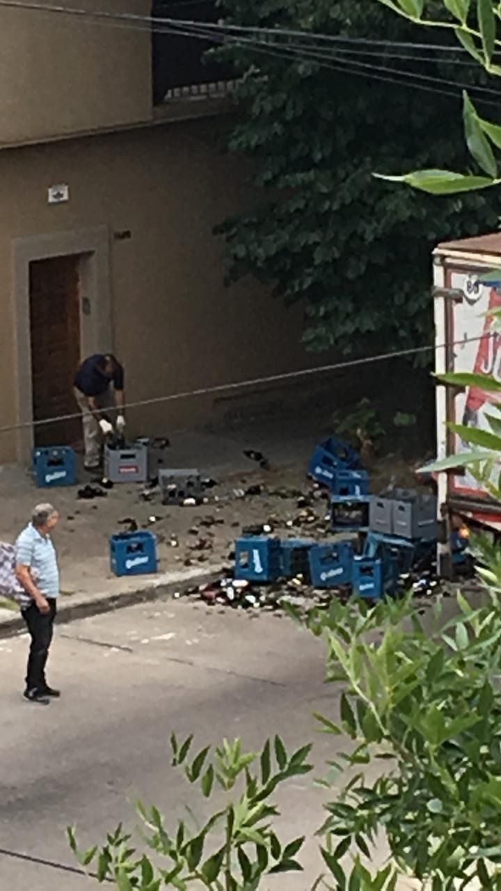 El insólito suceso ocurrió cerca del mediodía de este miércoles, a pocos metros del cruce de 25 y 45, donde, de acuerdo con los testigos, un camión que llevaba un importante cargamento de bebidas dobló a gran velocidad y perdió buena parte de los cajones de cerveza que llevaba.