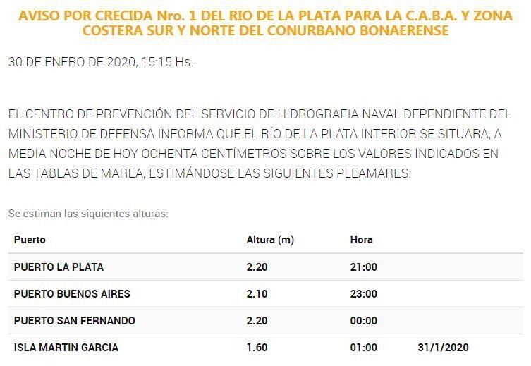 Aunque la altura del Río, por ahora, no resulta preocupante, los especialistas del área que depende del Servicio de Hidrografía Naval dependiente del Ministerio de Defensa advirtieron que comenzará a subir y podría llegar a superar los dos metros. Se trata de unos ochenta centímetros más que los valores habituales, por lo que podría generar algunos inconvenientes, sobre todo en las zonas costeras.