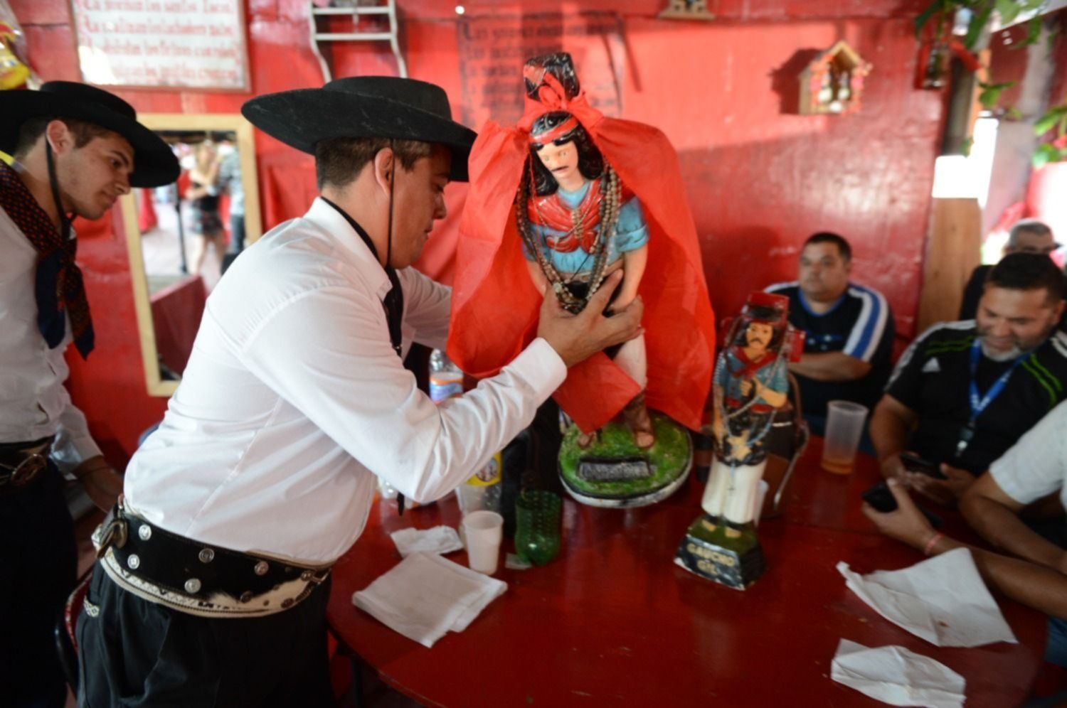 Al Gauchito se lo venera y saluda con vino y cigarrillos y principalmente se le pide por salud, trabajo y hogar. Junto a él, este mismo miércoles también se rindió tributo a San La Muerte. "La gente se piensa que es de los delincuentes y no es así; fue un monje, el protector del Gauchito Gil", le explicaron a este medio en esa esquina que luce adornada con banderas y santuarios rojos, el color del Gauchito.