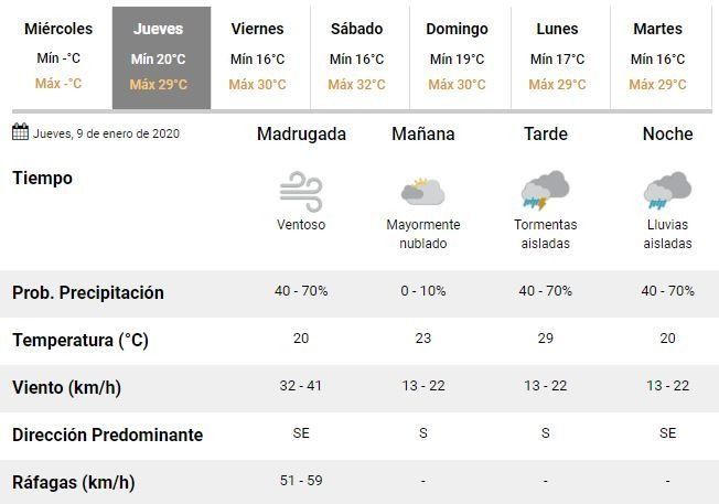 Los meteorólogos del organismo indicaron que en el inicio del próximo jueves se esperan fuertes vientos, con ráfagas de hasta 59 kilómetros por hora; y hacia la tarde y noche se prevé tormentas y lluvias en toda la ciudad. De acuerdo con las previsiones, la temperatura, en tanto, irá de unos 20°C de mínima hasta unos 29°C de máxima.