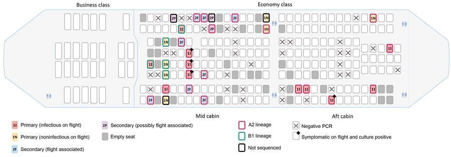 Según el estudio publicado en la revista Emerging Infectious Diseases, las personas que se encontraban en los asientos de ventanilla, en el centro de la cabina económica, tenían el mayor riesgo de contraer el virus, basándose en el análisis de la secuenciación del genoma de los pasajeros infectados. Al menos ocho y hasta posiblemente 11 pasajeros contrajeron el coronavirus durante dicho vuelo.