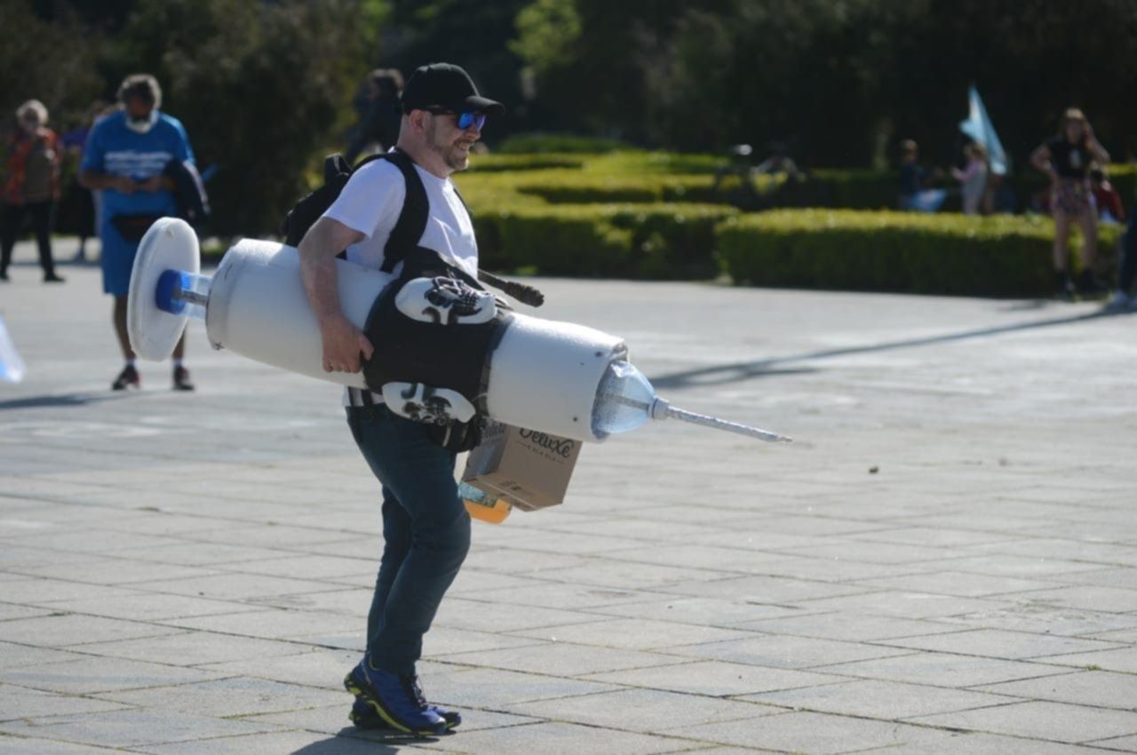 Como suele suceder en estas protestas, los manifestantes portan banderas argentinas, carteles contra la corrupción y pedir el cese de las restricciones que impuso el Gobierno nacional en el marco de la emergencia sanitaria. Una de las postales llamativas de la jornada fue la de un hombre que asistió una jeringa gigante.