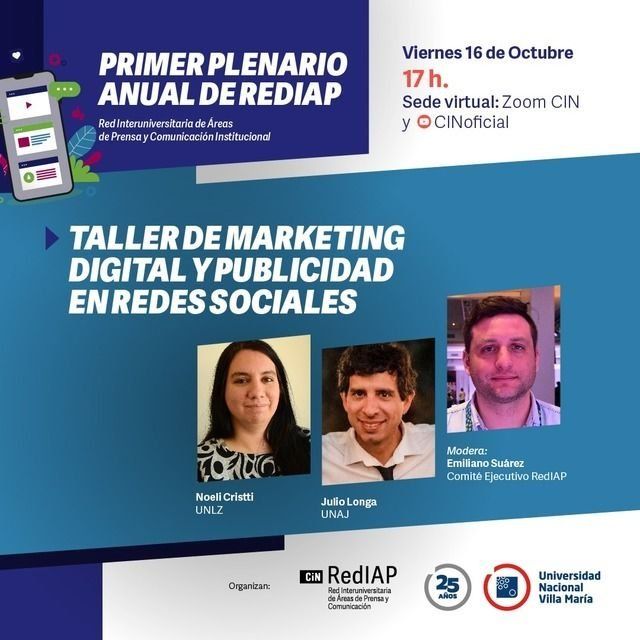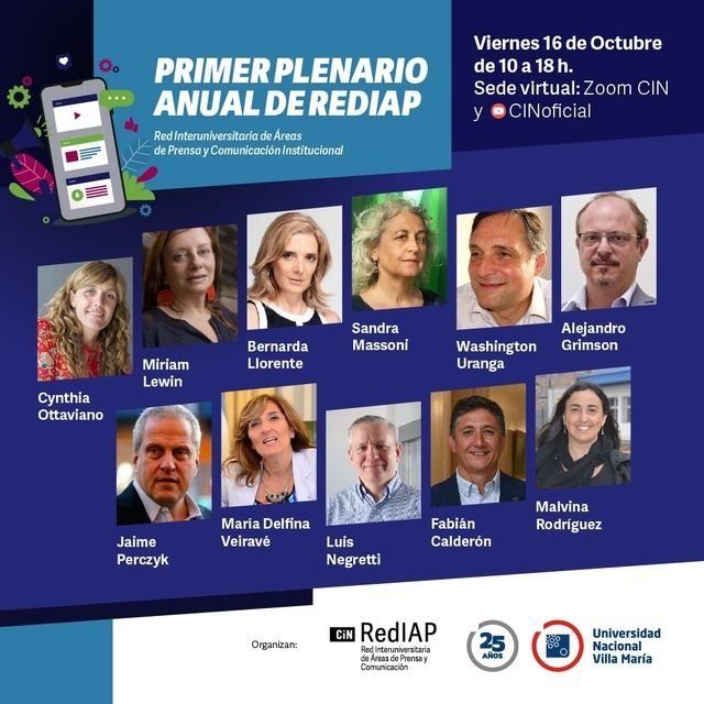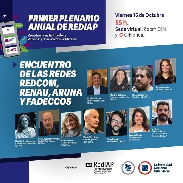 La Red Interuniversitaria de Áreas de Prensa y Comunicación Institucional (RedIAP), del Consejo Interuniversitario Nacional (CIN) realizará este viernes 16 su Primer Plenario anual. La actividad, organizada por la Universidad Nacional de Villa María, incluirá conferencias, talleres y paneles de debate con especialistas en comunicación y referentes del sistema universitario de todo el país.