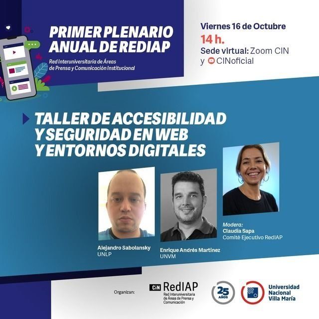 14h. Taller de Accesibilidad y Seguridad en web y entornos digitales. Experiencias de áreas de Prensa y Comunicación de universidades públicas. Modera: Claudia Sapa (Comunicación UNAM. Integrante del Comité Ejecutivo de RedIAP).