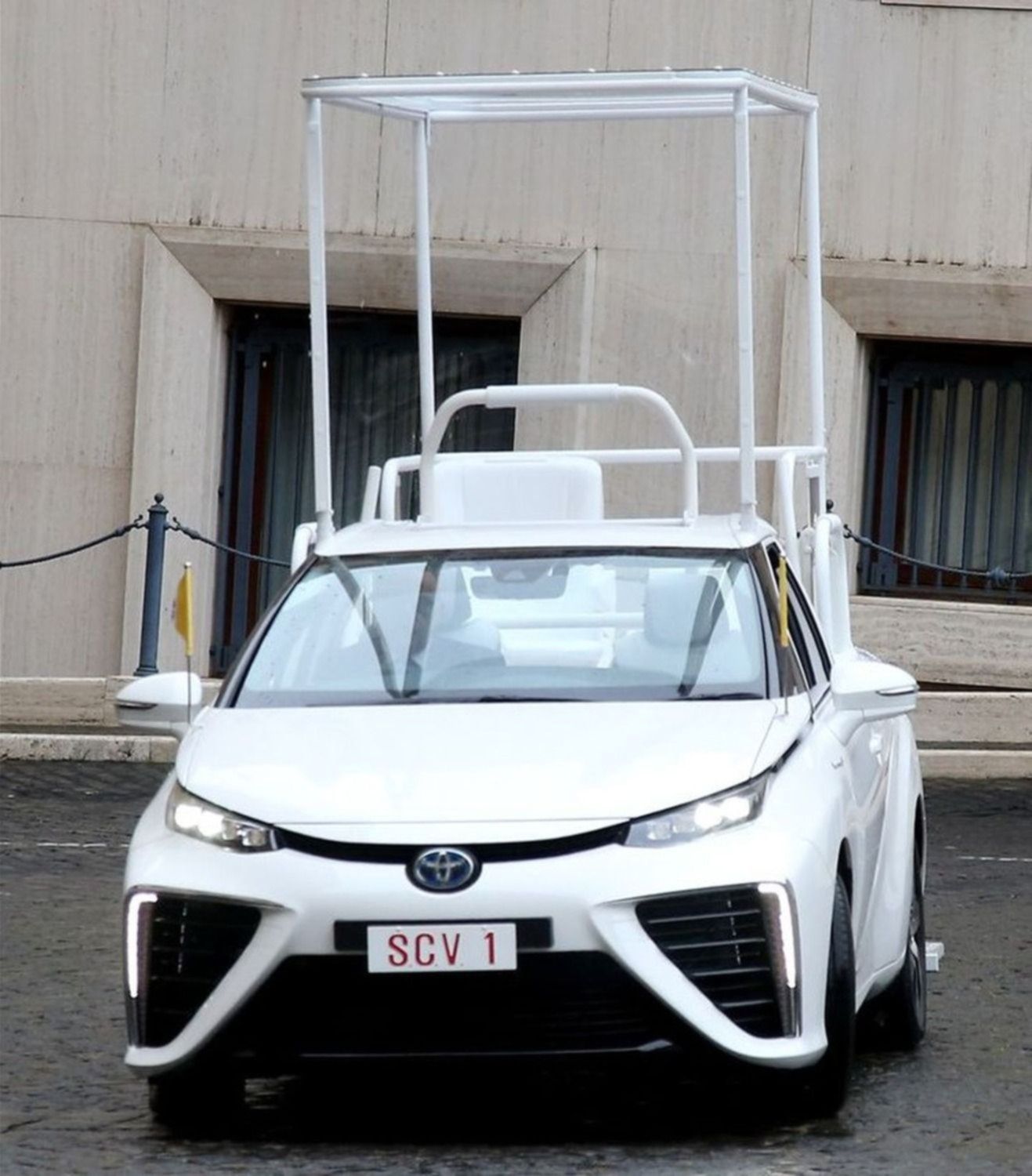 El mismo fue construido sobre la base del modelo Toyota Mirai. La firma japonesa desarrolló dos unidades especialmente adaptadas para trasladar al pontífice, el cual se destaca por ser de tipo ecológico.