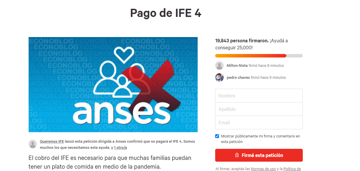 Mientras el Gobierno define el futuro del IFE, fue lanzada una campaña en redes sociales para recaudar firmas en reclamo del cuarto pago. La petición fue publicada en la plataforma www.change.org y a pocos días de la publicación ya fueron registradas 4.222 firmas de las 5.000 buscadas.