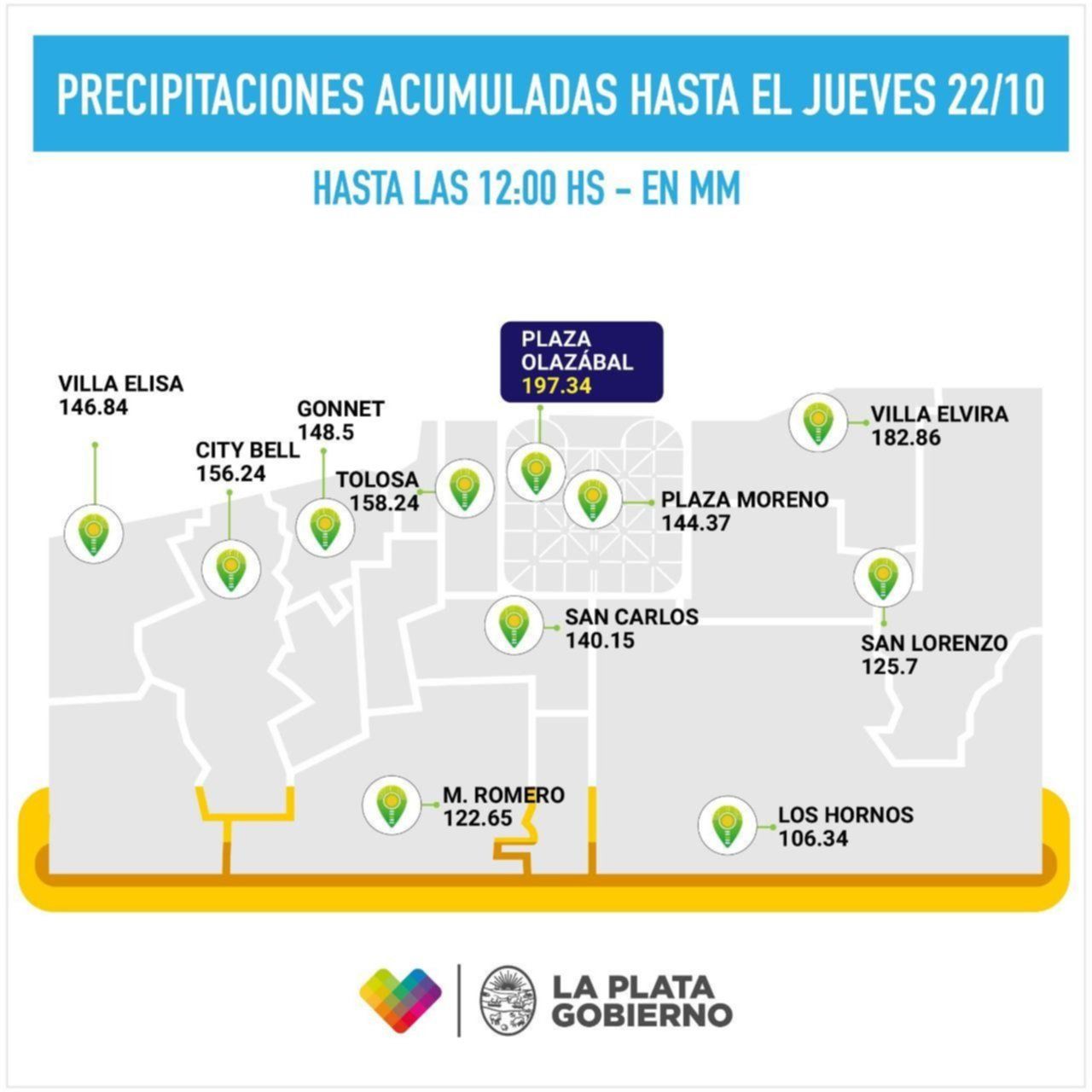 Además, se detalló que las lluvias acumuladas en todo este episodio de mal tiempo, que comenzó el lunes por la tarde hasta este mediodía, alcanzó en Plaza Olazábal los 197 mm.; en Villa Elvira, 182 mm.; en Tolosa, 158 mm.; y en City Bell, 156 mm.