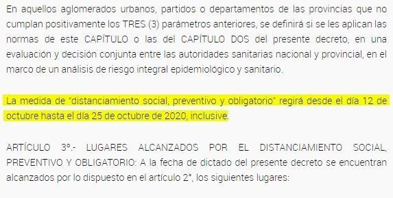 Así las cosas, según puede leerse en el texto del último Decreto publicado, "la medida de 'distanciamiento social, preventivo y obligatorio' regirá (…) hasta el día 25 de octubre de 2020, inclusive". De esto se desprende que la actual etapa de la cuarentena debía terminar el próximo domingo, por lo que esta nueva fase se extenderá por dos semanas a partir del lunes y terminará el domingo 8 de noviembre.