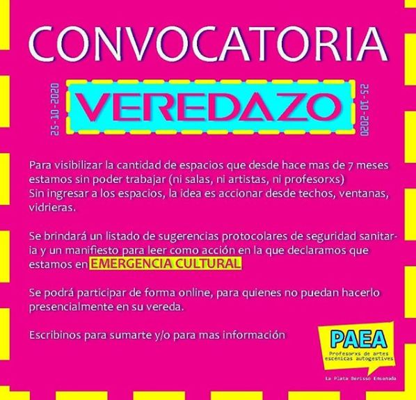Además, dio detalles del “veredazo” que desarrollarán el próximo sábado 31 de octubre para visibilizar la situación que atraviesa el sector y exponer el trabajo de gran cantidad de artistas platenses. "Son casi 30 espacios los que van a participar del Veredazo. Pertenezco a Teatro Práctico que tuvo que cerrar, hace nueve años que funcionaba en el mismo lugar", subrayó.