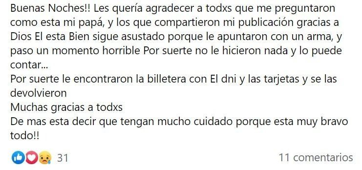 "Él está bien, sigue asustado porque le apuntaron con un arma y pasó un momento horrible. Por suerte, no le hicieron nada y lo puede contar", explicó la joven en la publicación de Facebook. "De más está decir que tengan mucho cuidado porque esta muy bravo todo", completó.