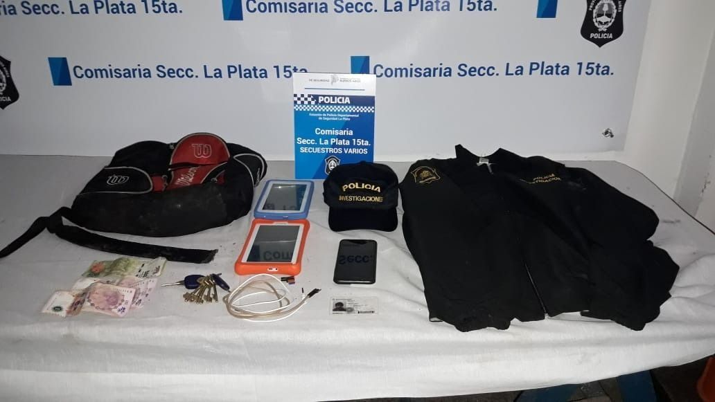 Luego de cercarles el camino y hacerlos descender del vehículo, las autoridades lograron identificar al subteniente, quien llevaba puesta una campera con la inscripción "Policía de Investigaciones". Asimismo, en la requisa hallaron el documento y el celular sustraídos previamente, 800 pesos, dos tablets, una gorra negra y una mochila.