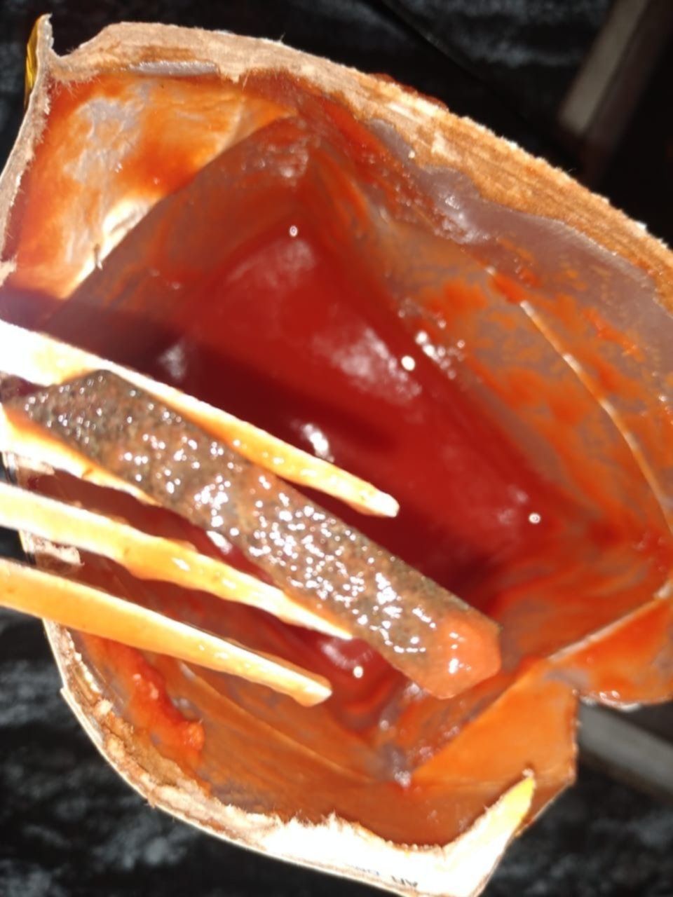 Minutos más tarde, el vecino de Los Hornos se sentó a almorzar junto a su esposa y percibieron lo mismo con la preparación: “Estaba agria, fea”. Ahí empezaron a buscar los productos utilizados, se fijaron si el paquete de arroz tenía gorgojos y no encontraron. Y llegaron al envase de cartón de la pulpa de tomate: entre la salsa hallaron un pequeño fierro oxidado.