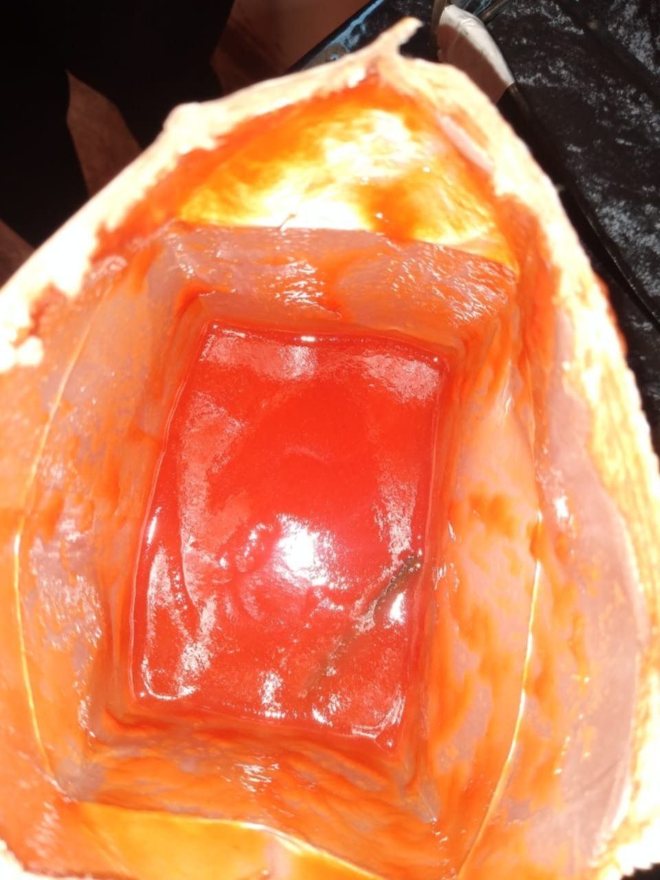 El denunciante todavía tiene guardada la caja con el pedazo de trincheta y remarcó que el envase hasta presenta cortes en su interior.
