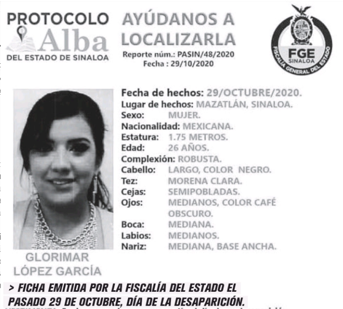 El secuestro ocurrió en la madrugada del 29 de octubre en Misiones de Mazatlán, en el estado de Sinaloa. Y en la ficha de búsqueda la Fiscalía General advirtió que la integridad de la joven "está en riesgo" y que podría ser víctima de la comisión de un delito. Por eso las autoridades pidieron a la población proporcionar cualquier información a la agencia especializada en desaparición forzada de personas.