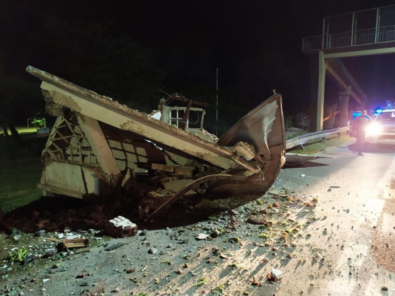 El refugio quedó totalmente destruido, pero afortunadamente no hubo que lamentar más personas lesionadas debido a que de casualidad no había pasajeros aguardando la llegada de algún colectivo. En tanto, el camión quedó cruzado sobre la ruta, que tuvo el tránsito cerrado hasta la finalización de los peritajes.