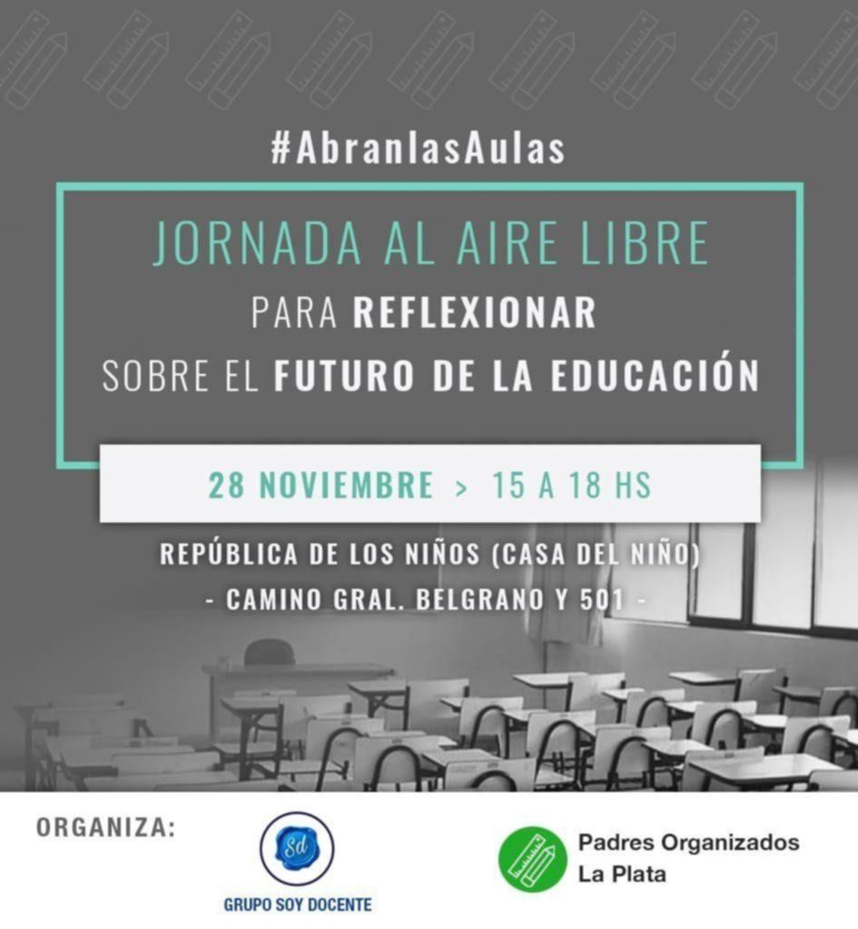 La convocatoria fue lanzada por Padres Organizados La Plata y el Grupo Soy Docente con la consigna #AbranlasAulas. Llamaron a participar de una jornada al aire libre “para reflexionar sobre el futuro de la educación” y diagramar una ofensiva para que las clases vuelvan a ser presenciales.