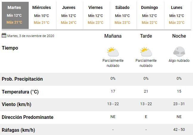 El Servicio Meteorológico Nacional adelantó que para este martes se espera una jornada de buen tiempo, con una temperatura mínima de unos 12°C y una máxima que rondará los 21°C.