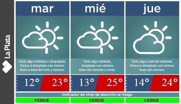 El pronóstico de los especialistas platenses indica además que también se espera un buen tiempo para los próximos miércoles y jueves, con temperaturas de entre 13 y 25°C y sin probabilidades de lluvia.