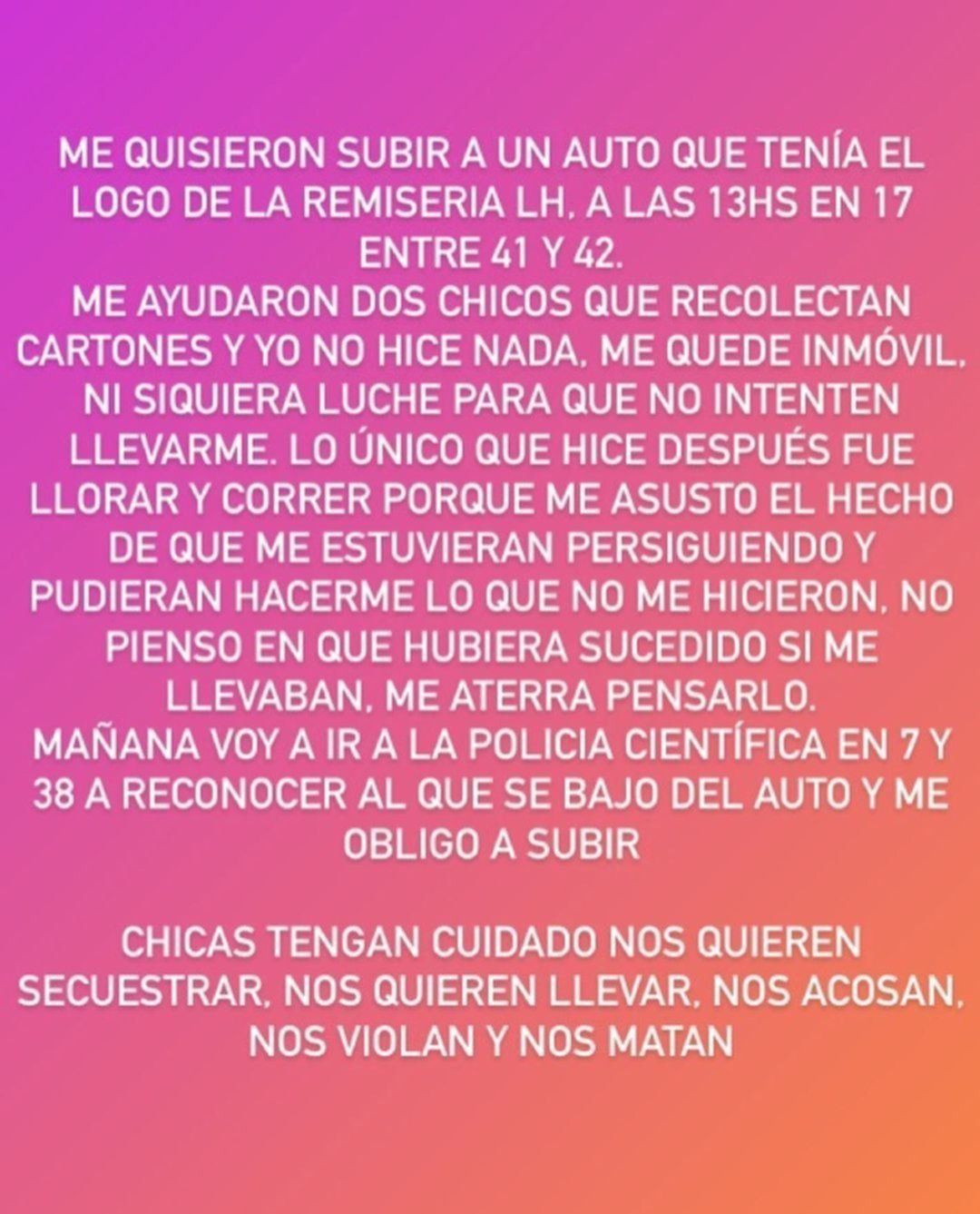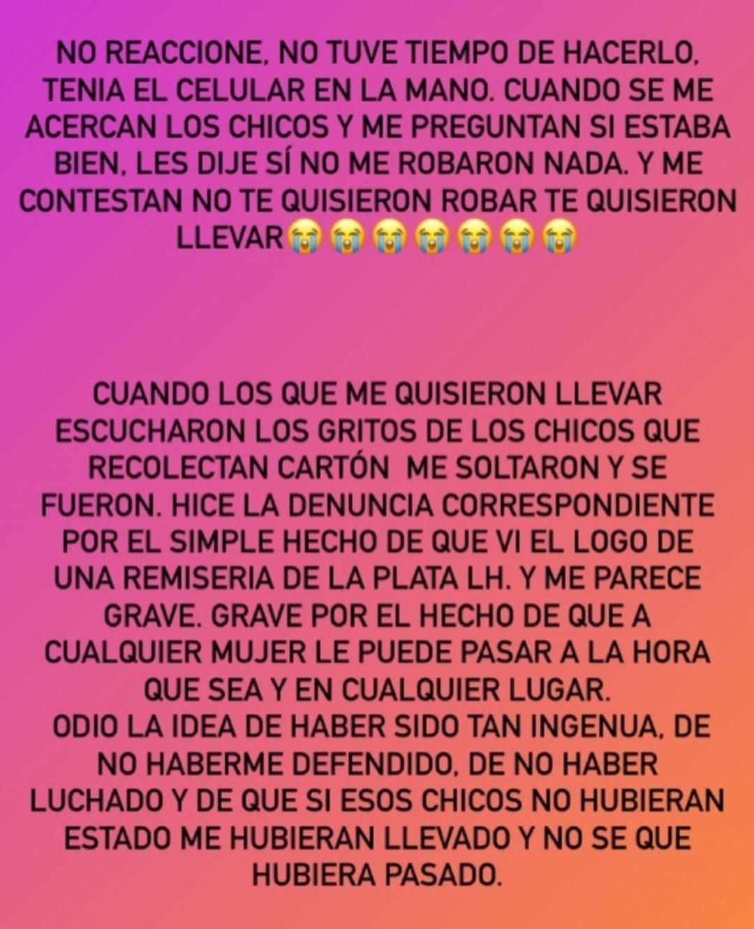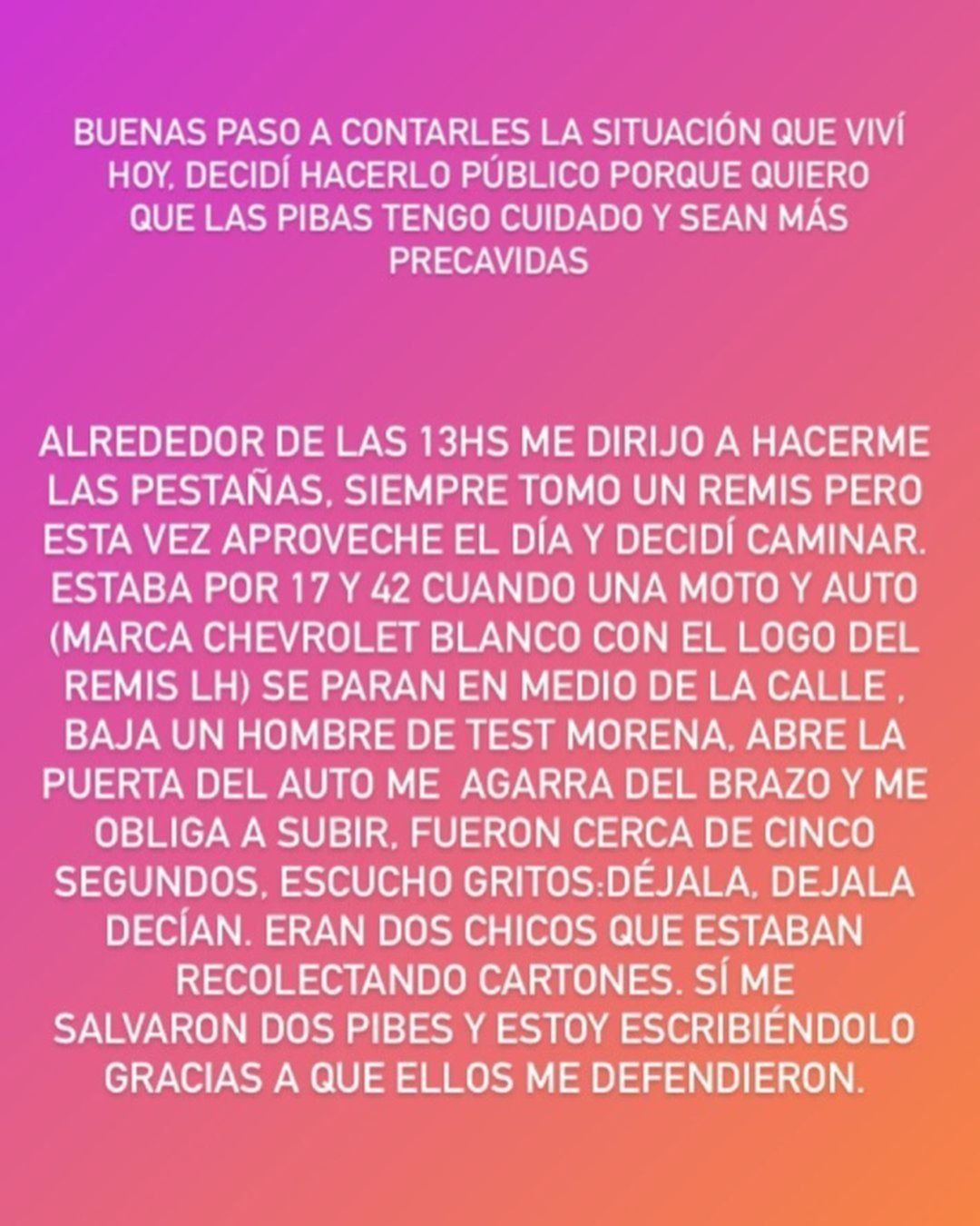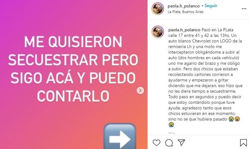Tal como detalla la joven, fueron los gritos de dos recolectores de cartones los que alertaron a los secuestradores, quienes se trasladaban dos en cada uno de los vehículos. "Agradezco tanto que esos chicos estuvieran en ese momento, sino no sé qué hubiera pasado", dijo la chica atacada.