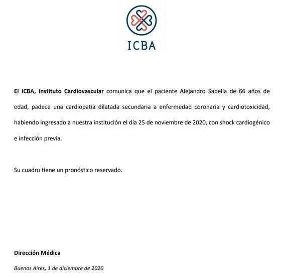 En ese sentido, la Dirección Médica del centro de salud emitió un comunicado en el que detalló que el exentrenador de 66 años padece una cardiopatía dilatada secundaria a enfermedad coronaria y cardiotoxicidad y precisaron que Sabella presentaba un shock cardiogénico e infección previa al momento de ingresar en el establecimiento sanitario, el pasado 25 de noviembre.