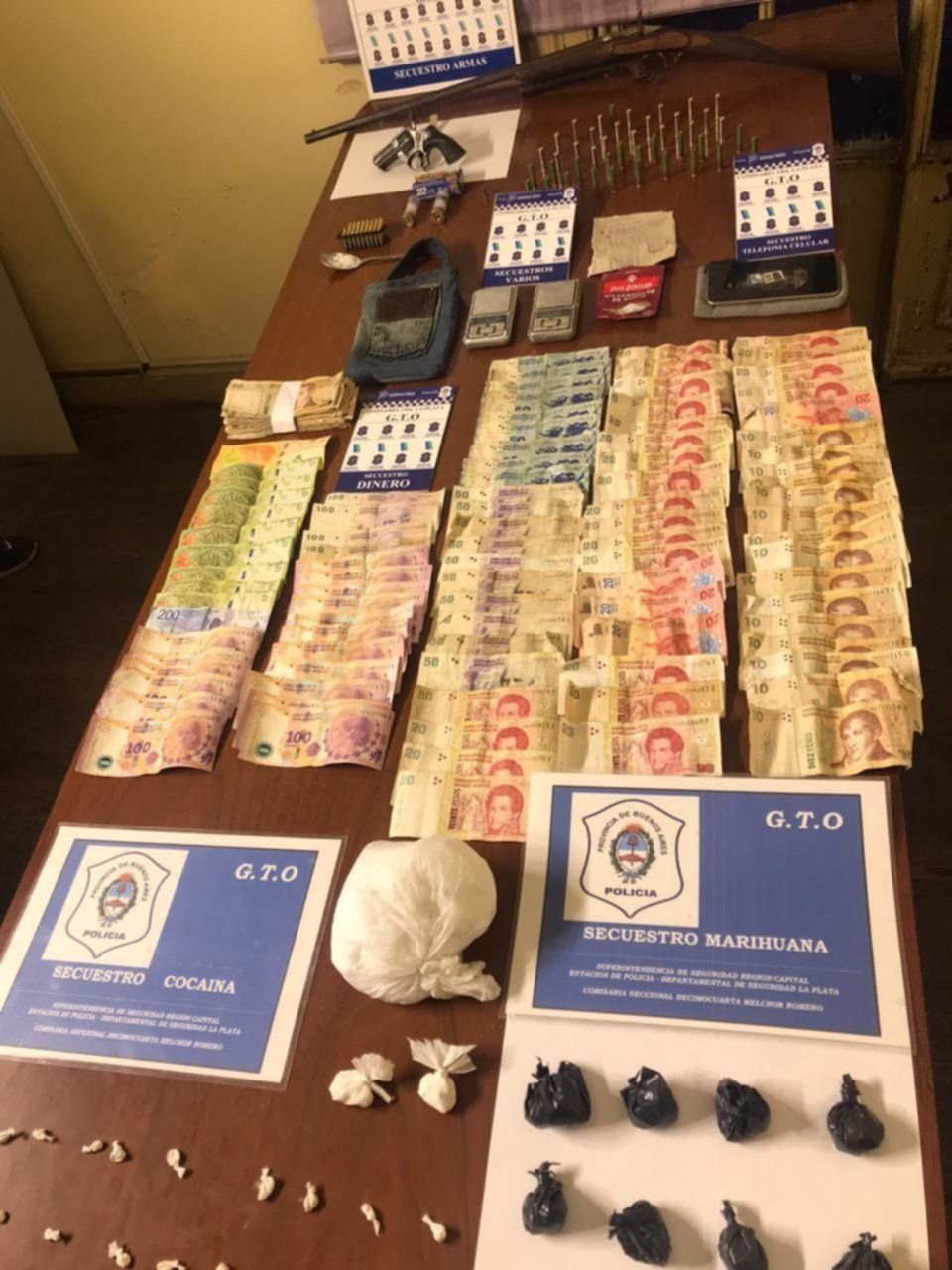 En los allanamientos, la policía secuestró 300 envoltorios de cocaína, 30 de marihuana, dinero en efectivo, dos armas de fuego, gran cantidad de municiones y celulares, entre otros elementos de interés para la causa. En el caso intervienen la UFI 15 y la UFI 18, ambas del Departamento Judicial de La Plata.