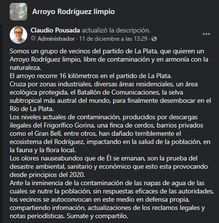 Y publican sus propias investigaciones. En uno de los posteos de la página de Facebook "Arroyo Rodríguez Limpio" el vecino Roberto Bertone relata su propio relevamiento y menciona distintos emprendimientos industriales con desagües visibles, como una fabrica de pinturas en la naciente, el testimonio de vecinos sobre la descarga de camiones atmosféricos, una fábrica de agroquímicos y distintas urbanizaciones precarios y formales que tienen distinto impacto.