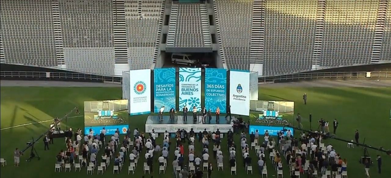 El presidente Alberto Fernández y la vicepresidenta Cristina Fernández de Kirchner encabezaron junto al gobernador de la provincia de Buenos Aires, Axel Kicillof, un acto en el Estadio Único de La Plata, en el que el mandatario bonaerense trazó un balance del primer año de su gestión y anunció medidas para la "reconstrucción", vinculadas con lo social, la infraestructura de las escuelas y la vivienda para los sectores más postergado.