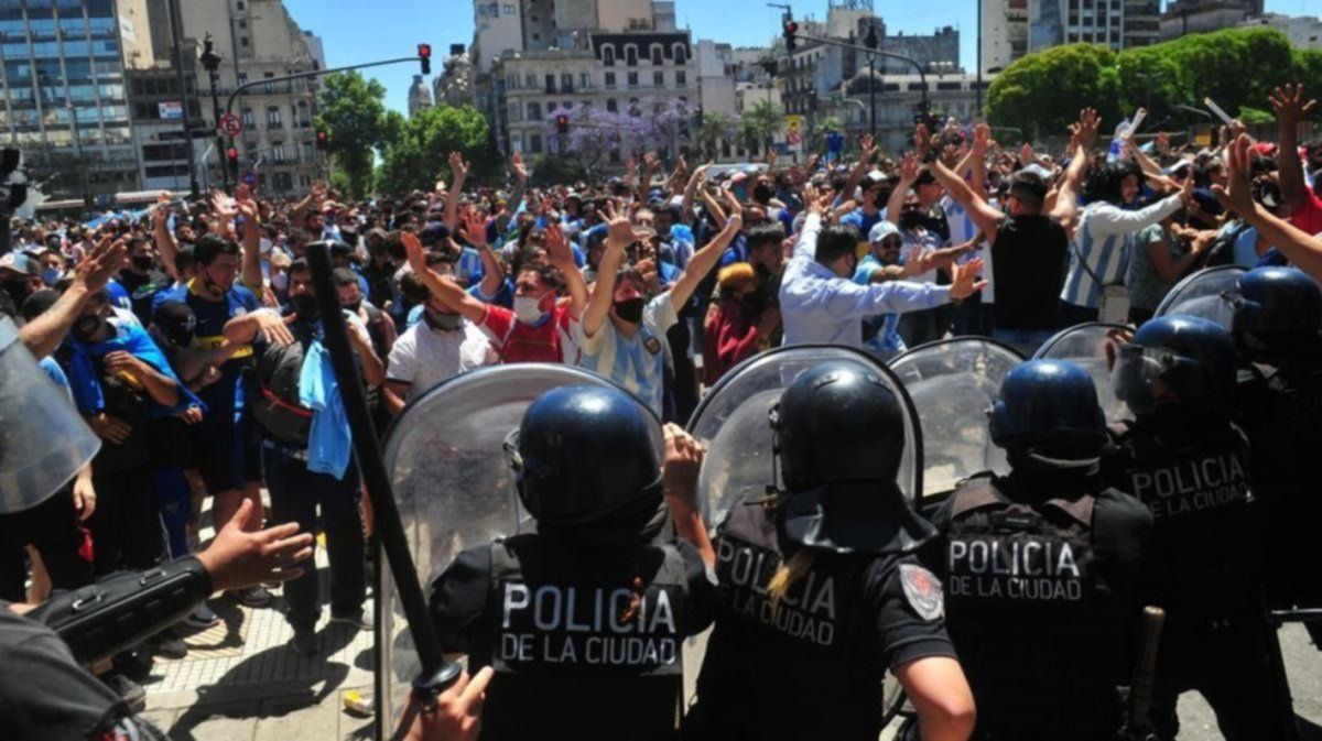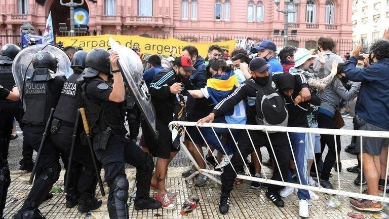 Los principales incidentes se registraron cuando la Policía tomó la orden, a las 13.30, de cortar el vallado en 9 de Julio y Avenida de Mayo, ante la resolución de finalizar con la ceremonia a las 16, como quería la familia del ex futbolista. Los focos de conflictos estallaron por todos lados: en el interior de Casa Rosada y afuera, con fuertes enfrentamientos entre grupos de personas y efectivos de la policía porteña.