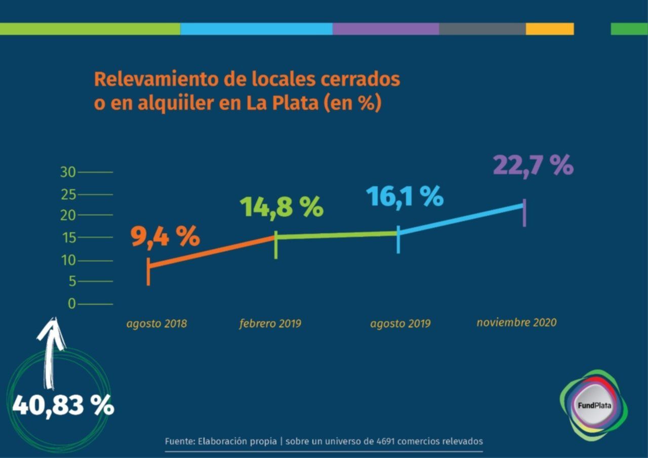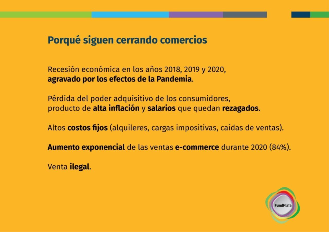 Fundplata advirtió que "la crisis que viene padeciendo el comercio local no es de ahora. Lo decíamos en el último informe: 'No puede pasarse por alto que dos años consecutivos de caída del Producto Bruto Interno (PBI), 2018-2019, marcaron un proceso recesivo de nuestra economía sumado al deterioro del poder adquisitivo del salario. Esta combinación impactó de lleno en el sector pyme-comercial e inmobiliario de nuestra Ciudad. Asimismo, la economía en este año insinuaba una mínima reactivación en los sectores más castigados en los últimos tiempos, sólo quedó en eso'. A partir de la declaración de la pandemia Covid-19 y la implementación de las distintas medidas sanitarias fue el determinante para que muchos comercios cierren sus persianas de manera definitiva".