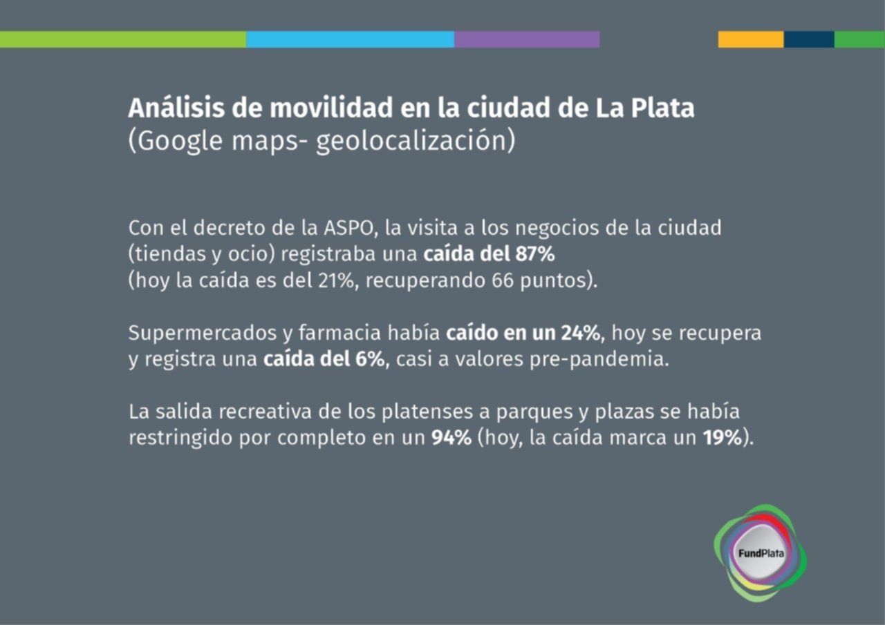 Los autores de la investigación notaron que "con el cambio de ASPO a DISPO, los platenses volvieron de a poco a su salida habitual, colaborando así al repunte de la actividad económica. Con el decreto de la ASPO, la visita a los negocios de la ciudad (tiendas y ocio) registraba una caída del 87%, mientras que hoy la caída es del 21%, es decir una recuperación de 66 puntos".