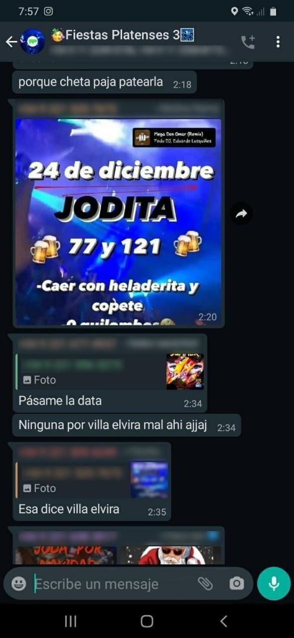 Como contó 0221.com.ar, en plena Nochebuena se organizaron eventos ilegales en distintos barrios platenses. “Siguen las fiestas en el grupo de WhatsApp. Fiestas de 150 a 500 personas, cuando ni siquiera se habilitaron de 200”, aseguró un lector que se comunicó a través del WhatsApp de este medio.